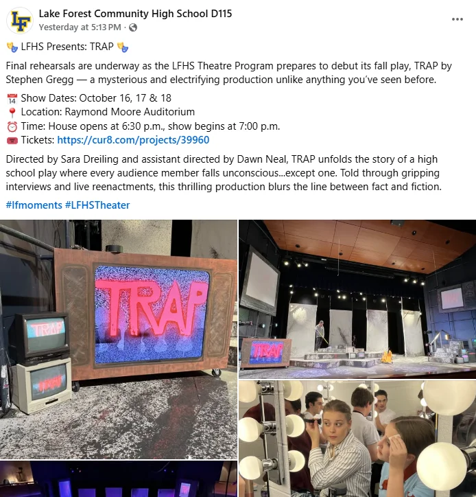 Lake Forest Community High School District 115 has announced that the Lake Forest High School (LFHS) theater program will present its fall play, "Trap" by Stephen Gregg. Performances are scheduled for October 16–18.